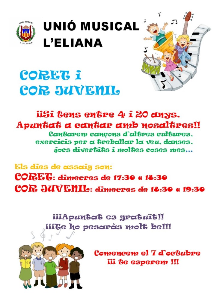El próximo miércoles, 7 de octubre, comenzarán los ensayos del Coret y el Cor Juvenil de la Unió Musical de l'Eliana. Esta formación está dirigida a niños y jóvenes entre 4 y 20 años que disfruten cantando y quieran aprender canciones de otras culturas además de ejercicios para trabajar la voz y muchos juegos.
