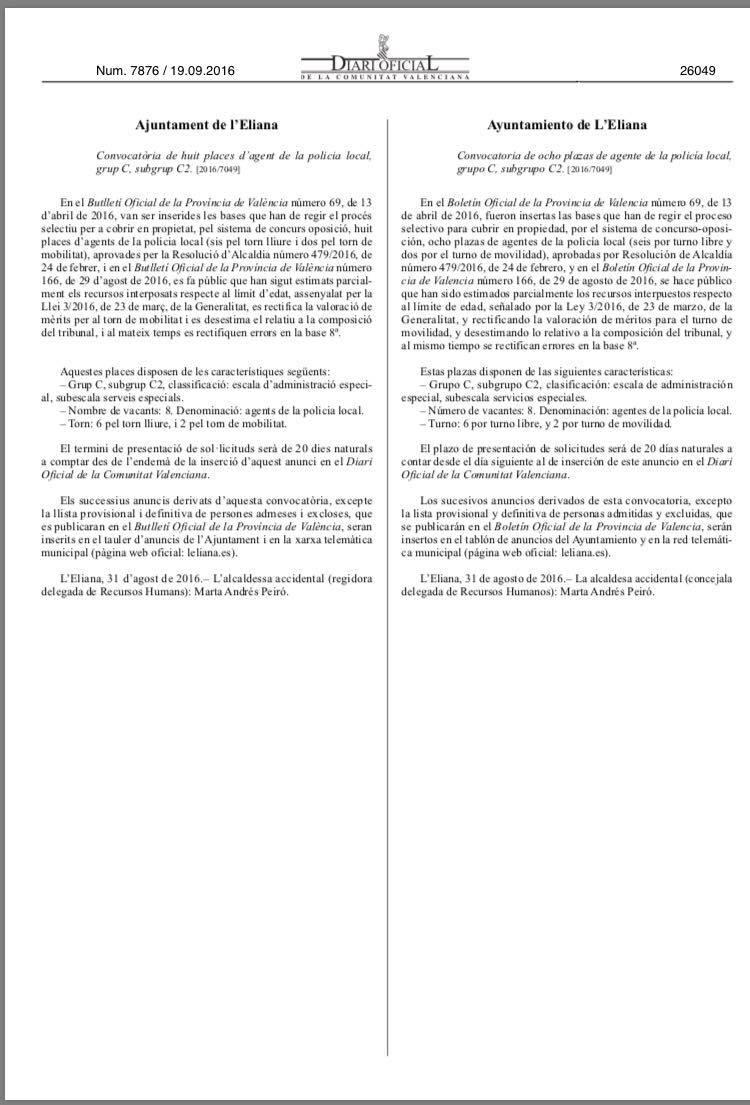 A partir de este martes 20 de septiembre, ya se pueden entregar por registro de entrada en el Ayuntamiento de l’Eliana, las instancias a la convocatoria de las ocho plazas de policía local, grupo C; subgrupo C2, según ha publicado el Boletín Oficial de la Provincia, para cubrir en propiedad por el sistema concurso-oposición.