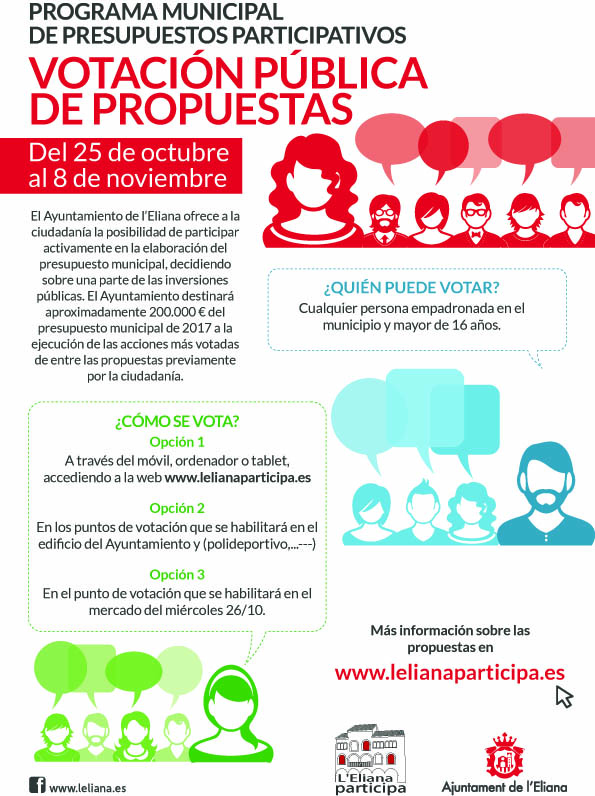 Todas estas propuestas están publicadas en la web antes mencionada junto con las que han sido rechazadas, explicándose el motivo por el que no han pasado a la fase de votación pública. Desde la Concejalía de Participación Ciudadana se invita a todos los vecinos y vecinas de l’Eliana a participar en este proceso de votación pública para decidir en qué se invierte la parte del presupuesto municipal 2017 correspondiente a este Programa.