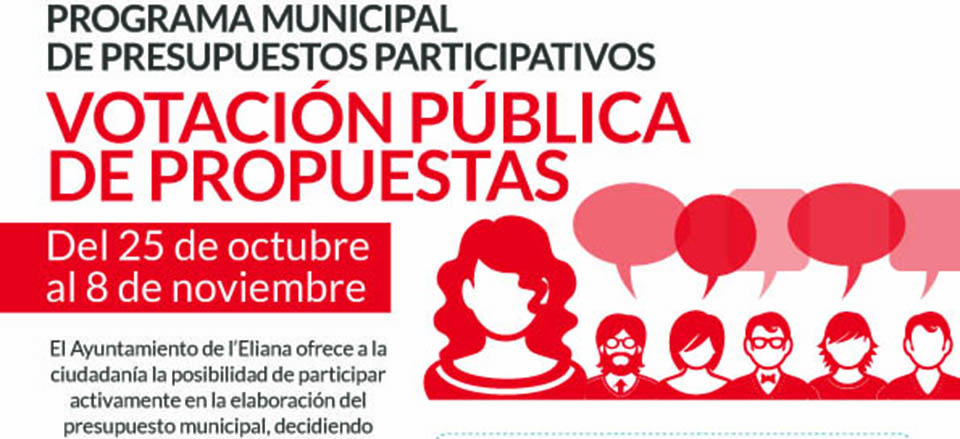 El Programa Municipal de Presupuestos Participativos del Ayuntamiento de l’Eliana llega a su fase de votación. En la fase anterior, la ciudadanía hizo llegar al consistorio sus propuestas, un total de 118, que han sido analizadas por técnicos municipales para determinar si cumplían con los criterios inicialmente establecidos. Dichos criterios eran que el presupuesto de ejecución de la propuesta no superara el importe disponible, de 200.000 euros; que no cuente ya con una partida específica dentro del presupuesto municipal; que tengan cabida dentro del capítulo de inversiones; que sea competencia del Ayuntamiento; que tenga viabilidad; que no requiera de un estudio previo más pormenorizado; y que no esté ya ejecutada o en vía de ejecución.
