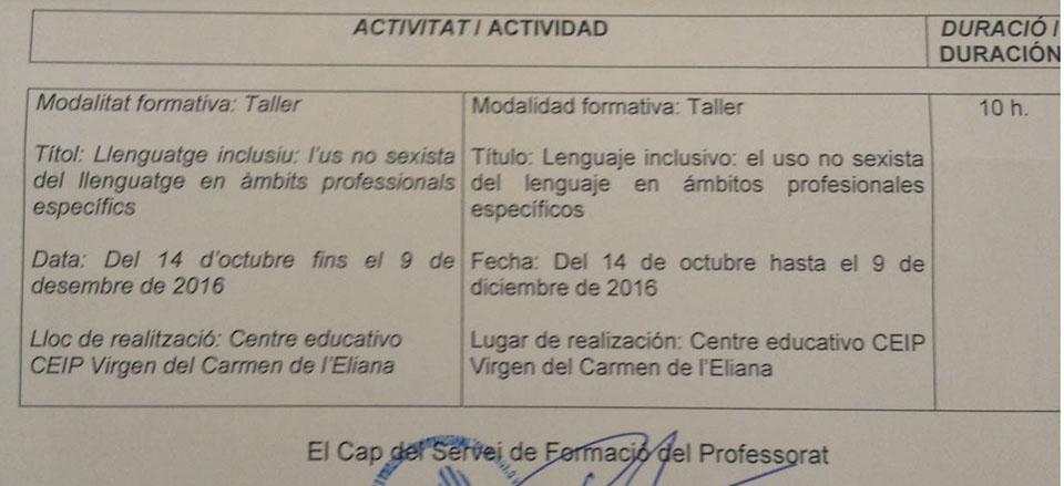 Este reconocimiento permitirá que los talleres sean reconocidos como actividades formativas para el profesorado que lo realice. Con fecha de 20 de octubre de 2016 ha sido comunicada la resolución del 13 de octubre de 2016 del Secretario Autonómico, Miguel Soler, donde resuelve reconocer de interés formativo el taller sobre lenguaje inclusivo sobre el uso no sexista del lenguaje, que desde la Concejalía de Igualdad está ofreciéndose en primer lugar a los docentes de los centros públicos, actividad inserta en un proyecto más amplio de talleres formativos en otros ámbitos, tanto públicos , como el personal del Ayuntamiento, como a las asociaciones y entidades privadas de implantación municipal, siendo una de las primeras acciones estratégicas que se aborda dentro del 'Plan de Igualdad' presentado en septiembre por el área.