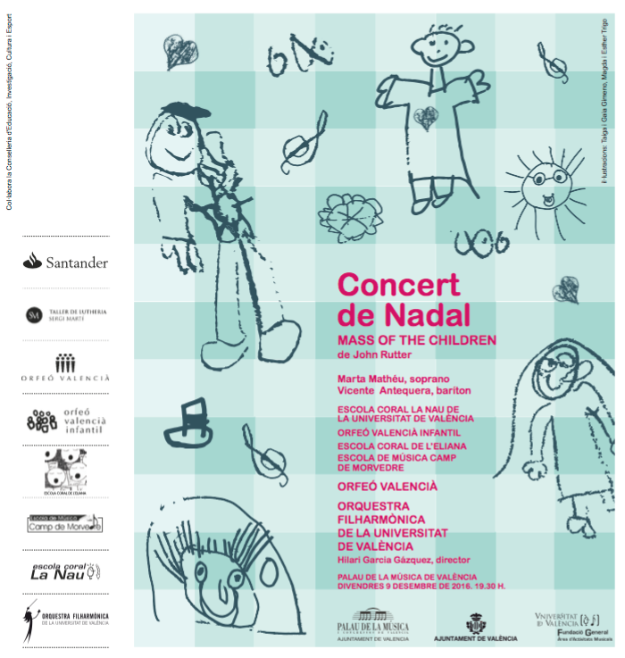 La Orquesta filarmónica y la Escuela coral la Nau de la Universitat de València, el Orfeón Valenciano, el Orfeón Valenciano Infantil y la Escola Coral de l'Eliana, con la soprano Marta Mathéu y el barítono Vicente Antequera, interpretarán un bellísimo concierto sinfónico-coral dirigido por Hilari García. El público podrá escuchar la Misa de los Niños de John Rutter, obra en qué prima el sentimiento y dolor, resultado de la lucha interior del compositor entre su fe y la pérdida de un hijo.