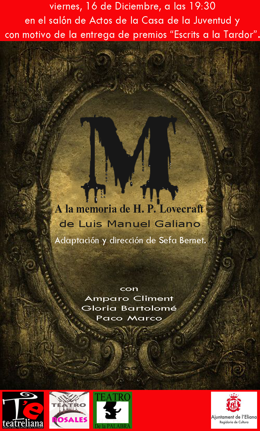Teatreliana representará el viernes,16 de diciembre, a las 19:30 h. en la Casa de la Juventud el cuento de Luis Manuel Galiano, quien ganó el premio local de 'Escrits a la Tardor' el año pasado llamado 'A la memoria de H.P Lovecraft'.