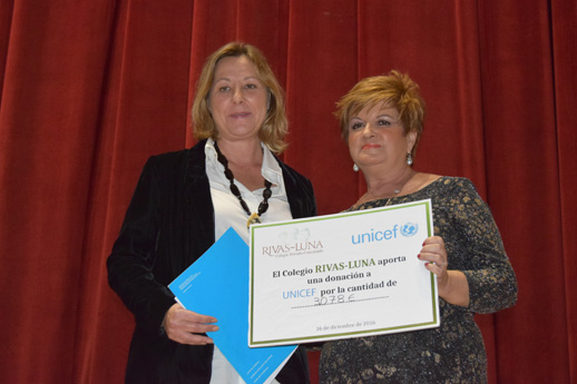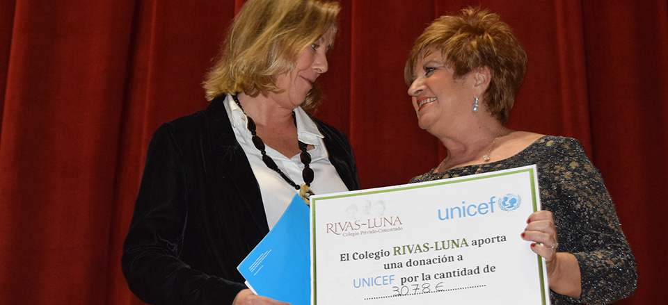 El Colegio Rivas-Luna hizo entrega a UNICEF España de un cheque solidario por valor de 3.078,00 euros en el año del 20 aniversario del centro educativo. La directora del colegio, Elisea García Rivas, agradeció la colaboración desinteresada de patrocinadores, colaboradores y padres y madres de alumnos/as que hicieron las donaciones solidarias y al propio colegio que llegó a donar hasta 1000€ para contribuir a la causa al entregarle el cheque a la representante de UNICEF Patricia Campos Domenech.