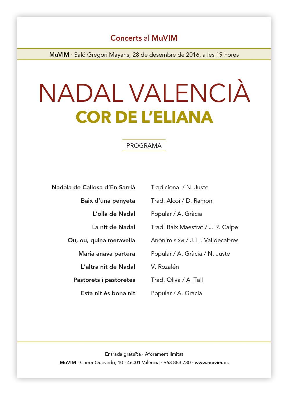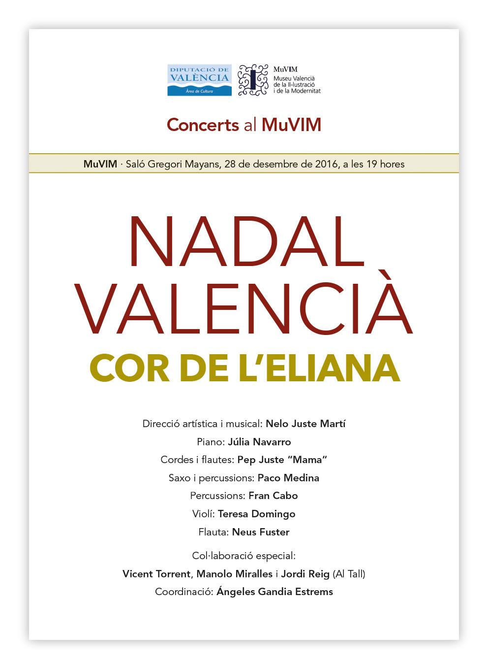 El Cor de L'Eliana cantarà nadales tradicionals valencianes, amb alguns dels temes del mític disc "Nadal valencià", viatjant en el temps amb música i escenificació el dimecres, 28 de desembre, a les 19:00 h. al Museu Valencià de la Il·lustració i la Modernitat-MuVIM. A més, el cor comptarà amb la col·laboració de luxe de Vicent Torrent i Manolo Miralles, membres d'Al Tall.