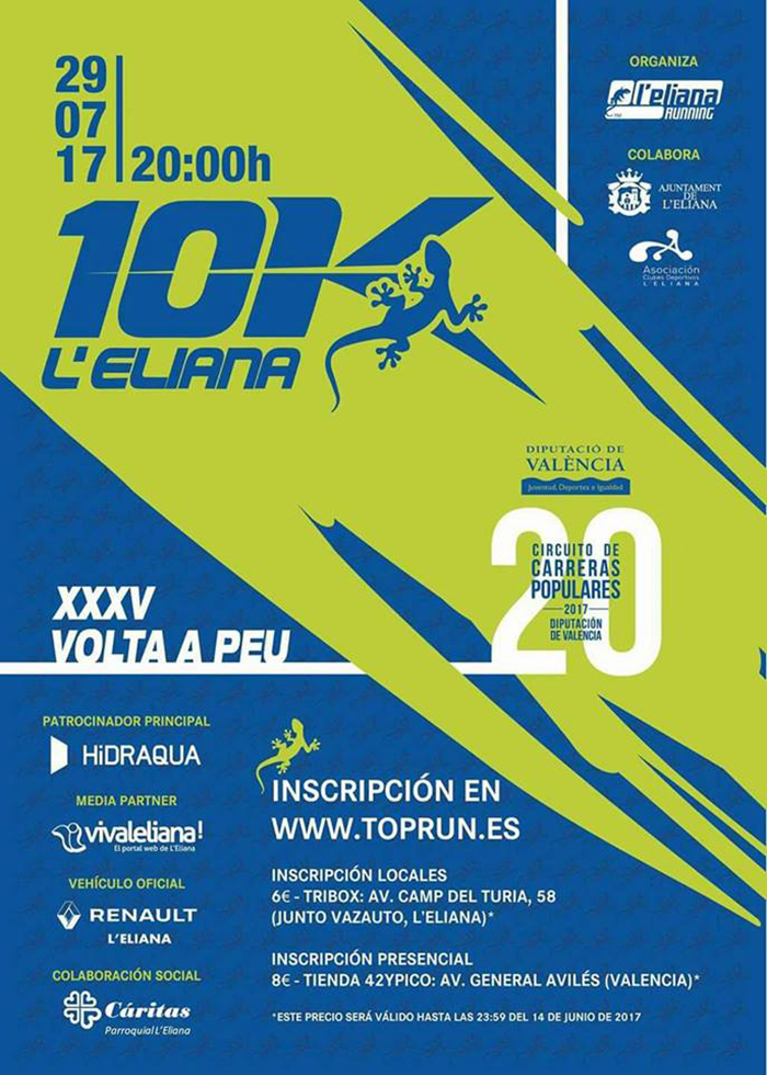 El plazo de inscripciones para participar en la prueba reina de l’Eliana estará abierto hasta el próximo miércoles 26 de julio tanto en las tienda Tribox de l’Eliana, como en 42y Pico en Valencia, además de en el siguiente enlace de la web TopRun https://www.toprun.es/events/xxxv-volta-a-peu-a-l-eliana-2017/miniweb
