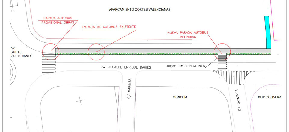 Las mejoras también incluirán la creación de un nuevo paso de peatones en la salida de la Calle Jazmines que dará un acceso más directo y seguro a los centros educativos, donde además se situará la definitiva parada de autobús