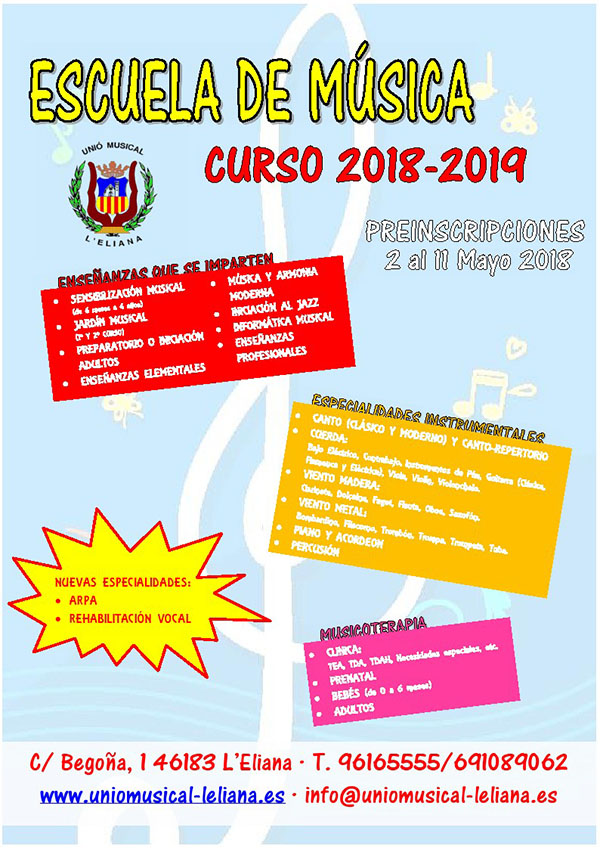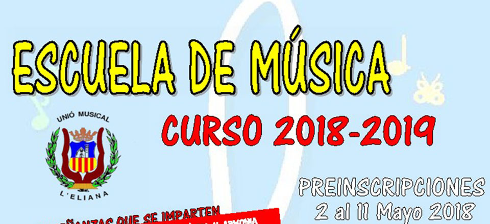 La Unió Musical L’Eliana amplía su oferta formativa musical para el curso 2018/2019, en su afán de poder ofrecer a toda la gente una enseñanza musical acorde con sus intereses e inquietudes.