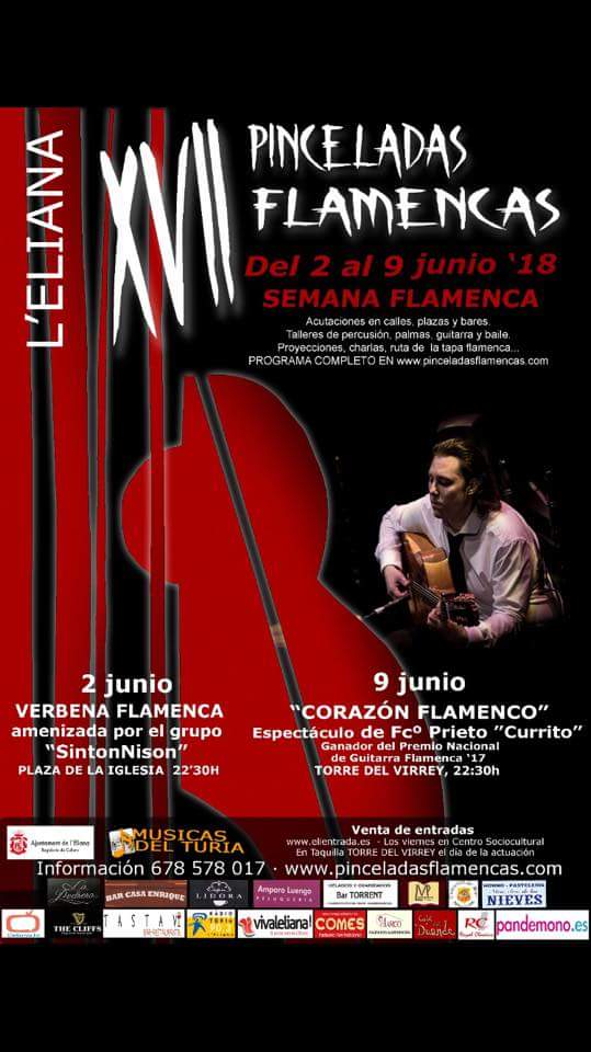 El sábado 2 de junio se abre la Semana con una FIESTA/VERBENA FLAMENCA en la Plaza de la Iglesia amenizada en directo por el grupo “SintonNison" a partir de las 22:30h. El Festival se prolongará hasta el sábado 9 de junio en la Torre del Virrey con el espectáculo CORAZÓN FLAMENCO, del guitarrista Francisco Prieto “Currito”, ganador del Premio Nacional de Guitarra Flamenca y que viene acompañado de baile, cante y percusión. Con esta actuación se inaugurará, al mismo tiempo, el Festival ESTIU A LA TORRE.