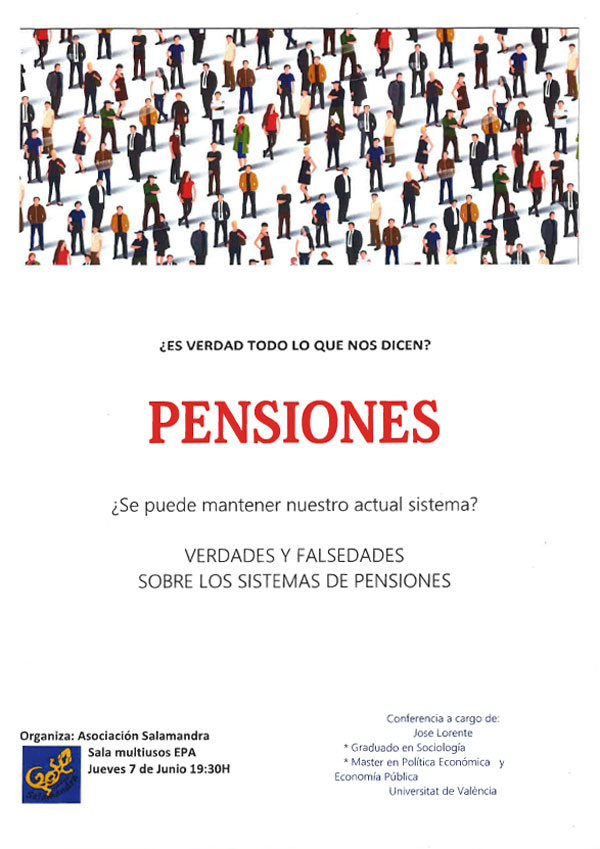 ¿ES VERDAD TODO LO QUE NOS DICEN? ¿Se puede mantener nuestro actual sistema?.'VERDADES Y FALSEDADES SOBRE LOS SISTEMAS DE PENSIONES' es el título de la conferencia técnica que pronunciará José Lorente Marco, el próximo jueves 7 de junio a las 19.30h en la sala multiusos dela EPA, organizada por la Asociación Salamandra.