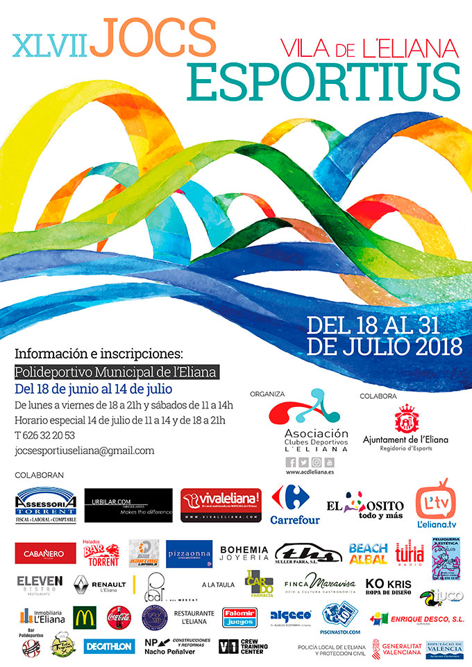 Organizados por la Asociación de Clubes Deportivos en colaboración con el Ayuntamiento de l’Eliana, los Juegos Deportivos, que se celebrarán del 18 al 31 de julio, cogen el relevo a las fiestas patronales de l’Eliana, y se convierten en el punto de reunión de familias y amigos que disfrutan de las noches de deporte en el polideportivo.