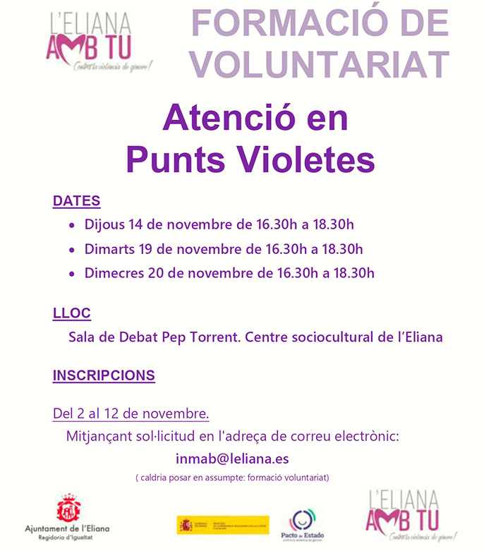 La Concejalía de Igualdad ha convocado una serie de acciones formativas dirigidas a todas aquellas personas que deseen formar parte del voluntariado en puntos violeta.