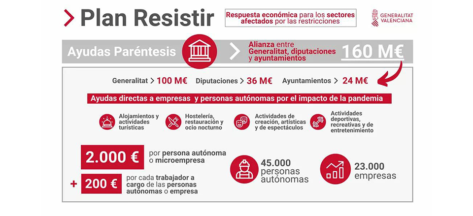 Las ayudas denominada Paréntesis estarán subvencionadas en un 62,5% por la Generalitat Valenciana, que aportará 100 millones de euros; en un 22,5% por las Diputaciones Provinciales, y en un 15% por los Ayuntamientos