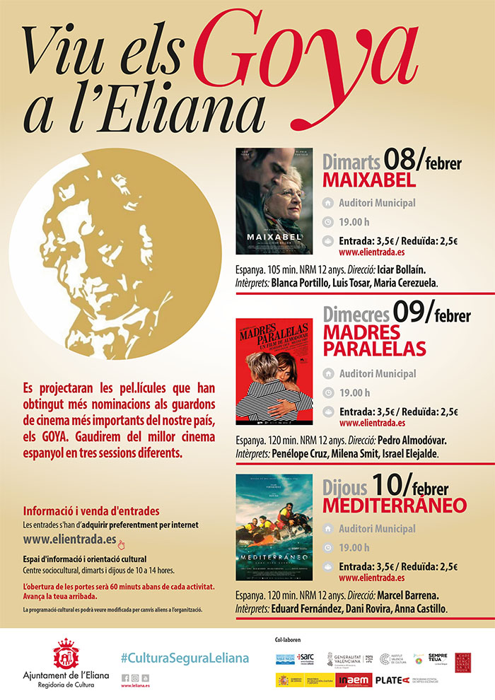 La Concejalía de Cultura del Ayuntamiento de l’Eliana, coincidiendo con la celebración de los Premios Goya, ha organizado una serie de proyecciones de las películas que han obtenido más nominaciones a los galardones del séptimo arte más importantes de nuestro país. De esta forma, el público elianero podrá disfrutar del mejor cine español en tres sesiones diferentes, entre el martes 8 y el jueves 10 de febrero.