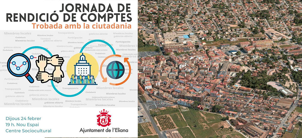 El Ayuntamiento de l’Eliana ha organizado, por segunda vez en su historia, una Jornada de Rendición de Cuentas. Se trata de un encuentro con la ciudadanía en el que el equipo de gobierno presentará las actuaciones municipales realizadas en el periodo 2019/2021, así como los proyectos iniciados a partir de este mismo año.