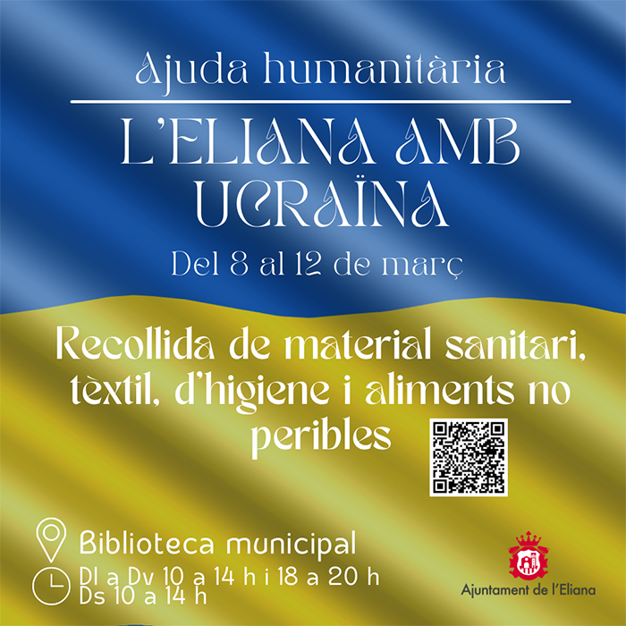 El Ayuntamiento de l’Eliana ha organizado una campaña de recogida de ayuda humanitaria ante la actual crisis en Ucrania. Así, los vecinos y vecinas que deseen participar pueden hacerlo de lunes a viernes, de 10 a 14 horas y de 18 a 20 horas y el sábado por la mañana, de 10 a 14 horas en el punto habilitado en la Biblioteca Municipal. La recogida de enseres y materiales, estará activa del martes 8 hasta el próximo sábado 12 de marzo.