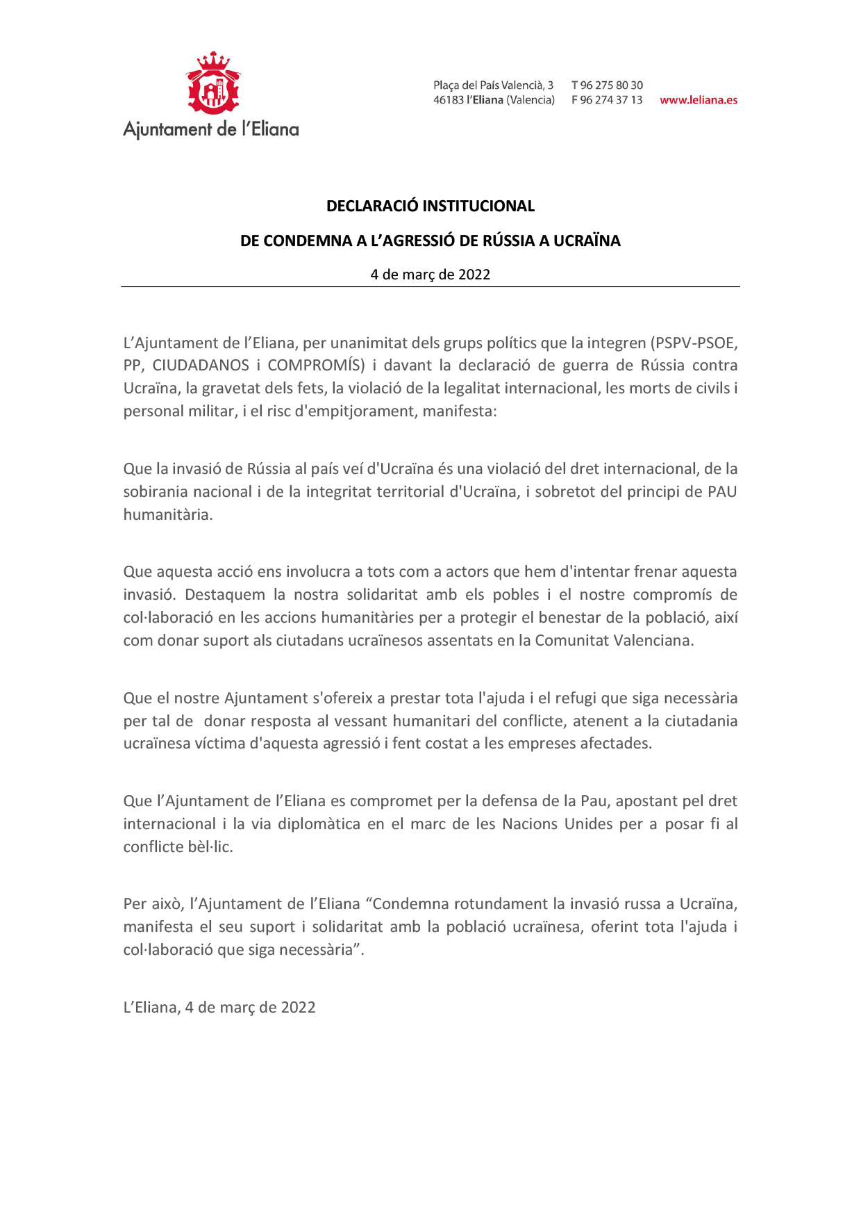 En la declaración institucional manifiestan su apoyo y solidaridad con la población ucraniana y ofrecen toda la ayuda y colaboración que sea necesaria. “Desde el Ayuntamiento estamos comprometidos con la defensa de la paz y el principio de solidaridad entre los pueblos” ha recordado el primer edil, Salva Torrent.